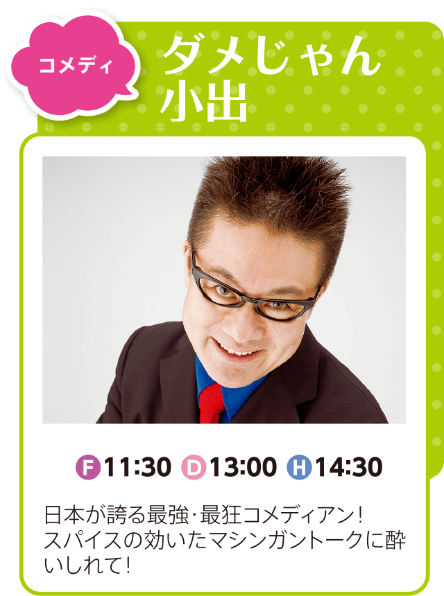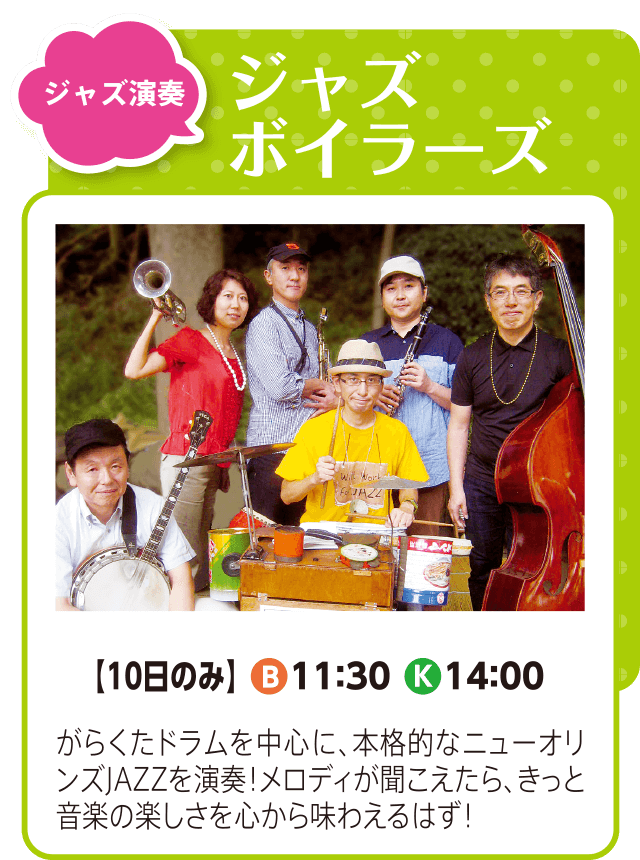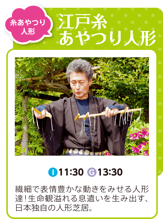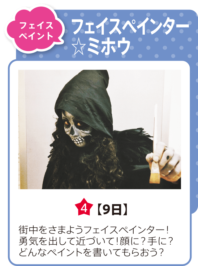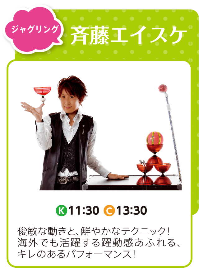 自由に動き回る大道芸人が会場のあちらこちらに出没!全員に出会うことができるかな??