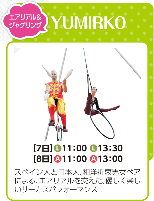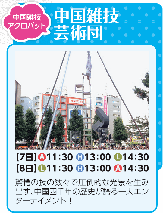 自由に動き回る大道芸人が会場のあちらこちらに出没!全員に出会うことができるかな??