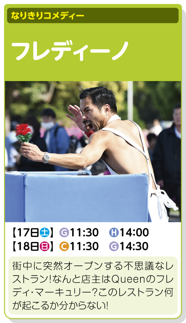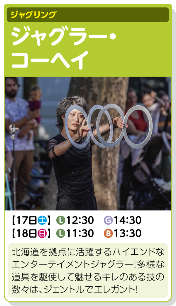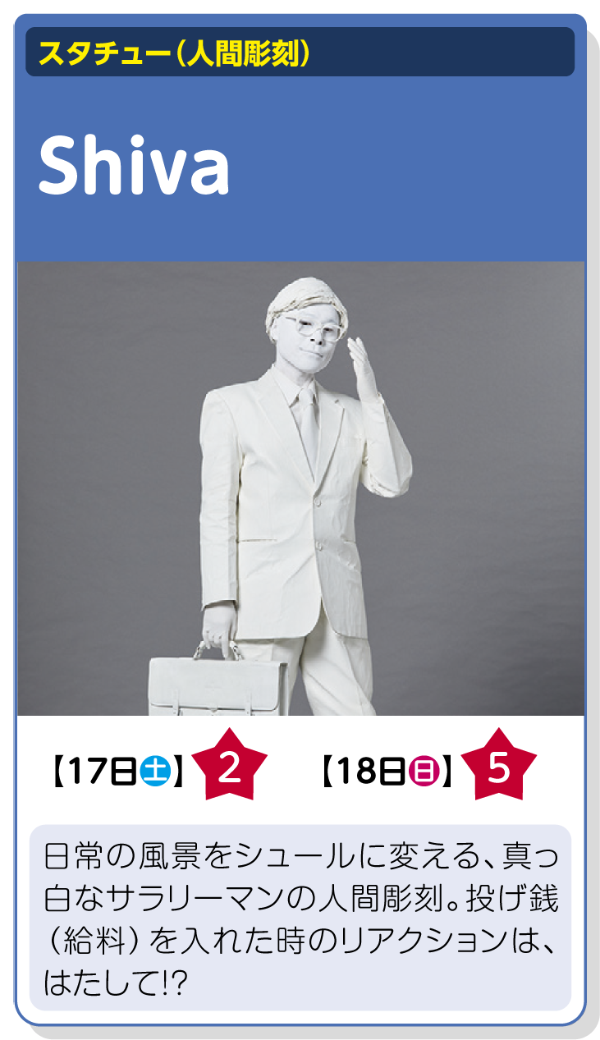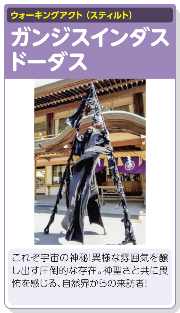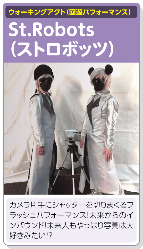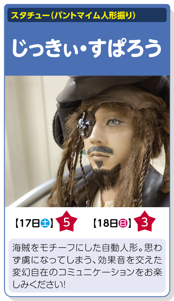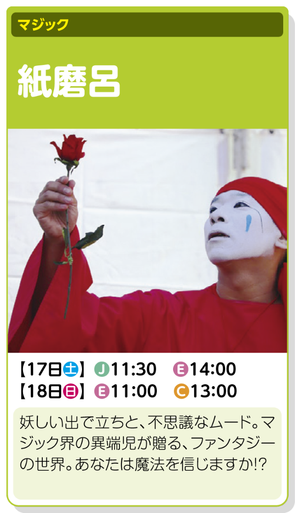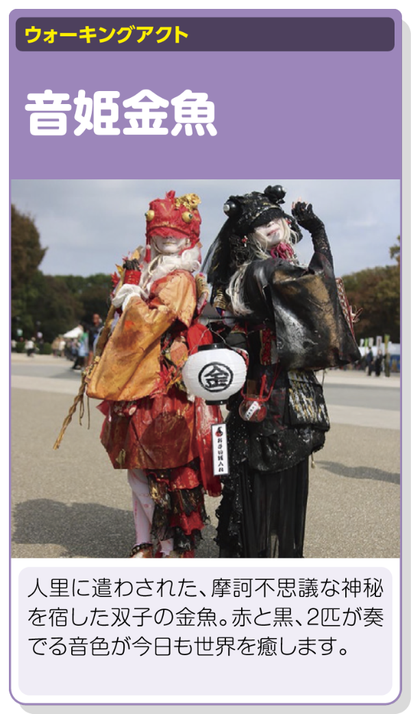 自由に動き回る大道芸人が会場のあちらこちらに出没!全員に出会うことができるかな??