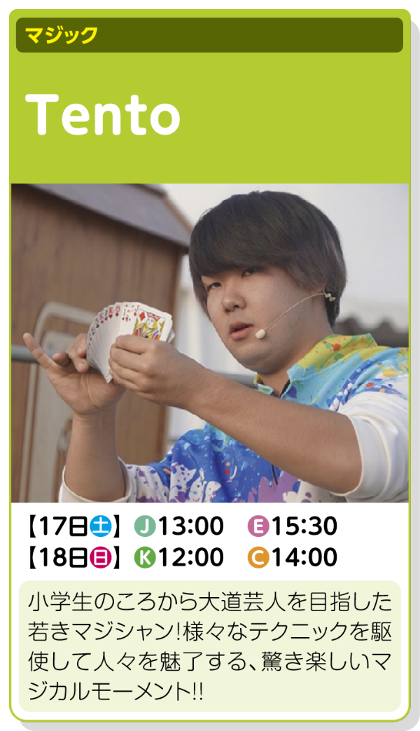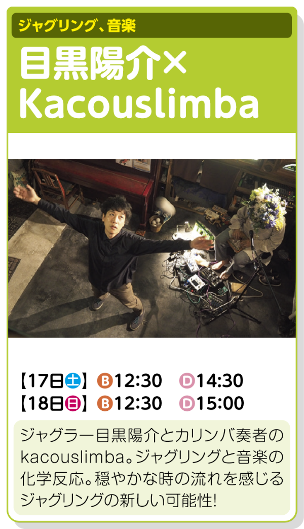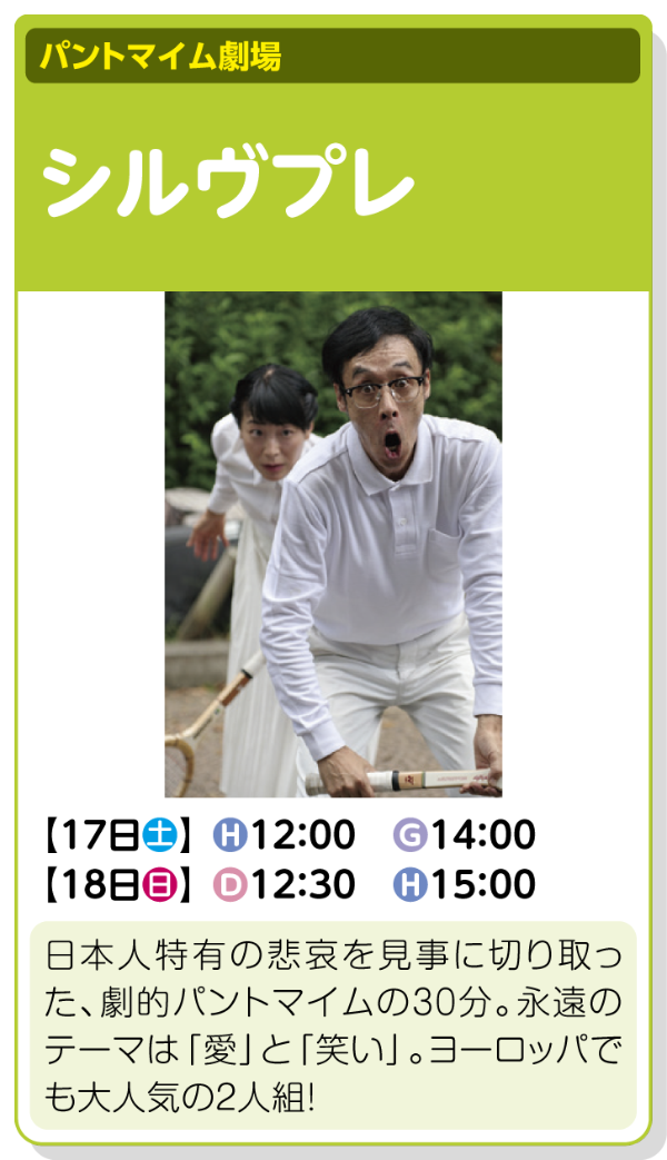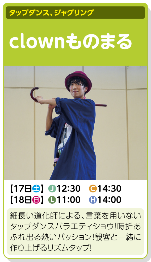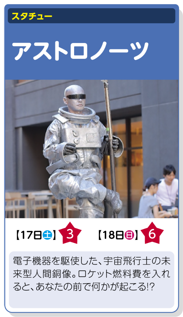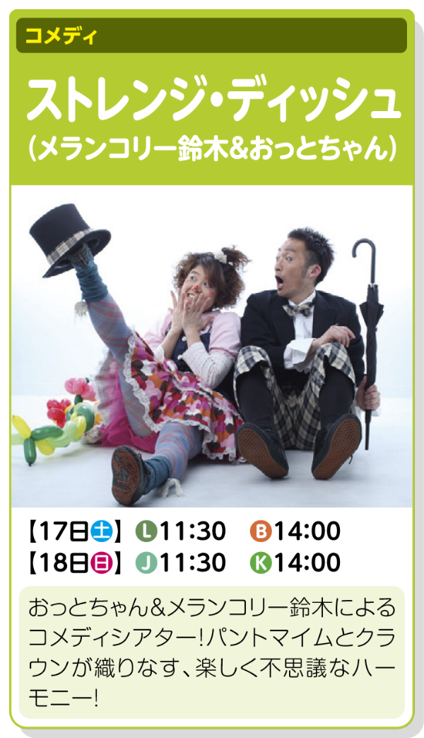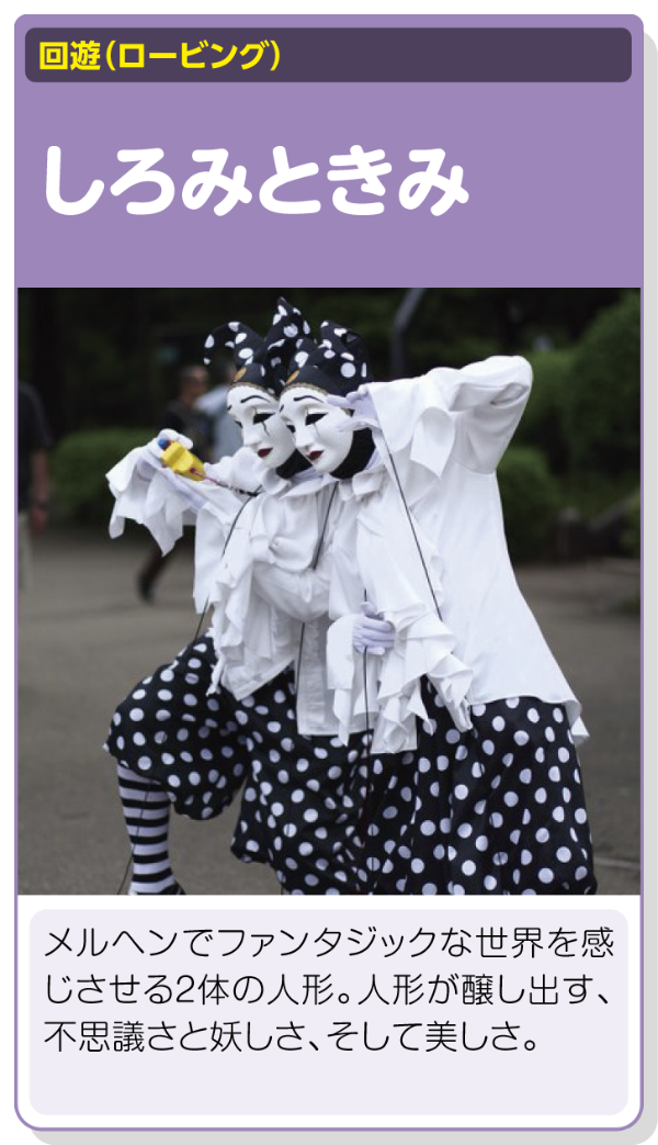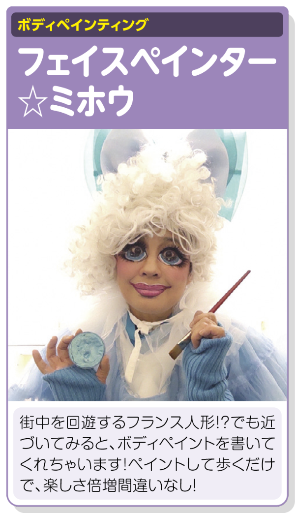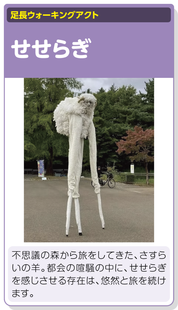 自由に動き回る大道芸人が会場のあちらこちらに出没!全員に出会うことができるかな??
