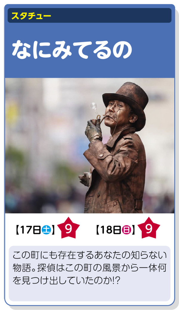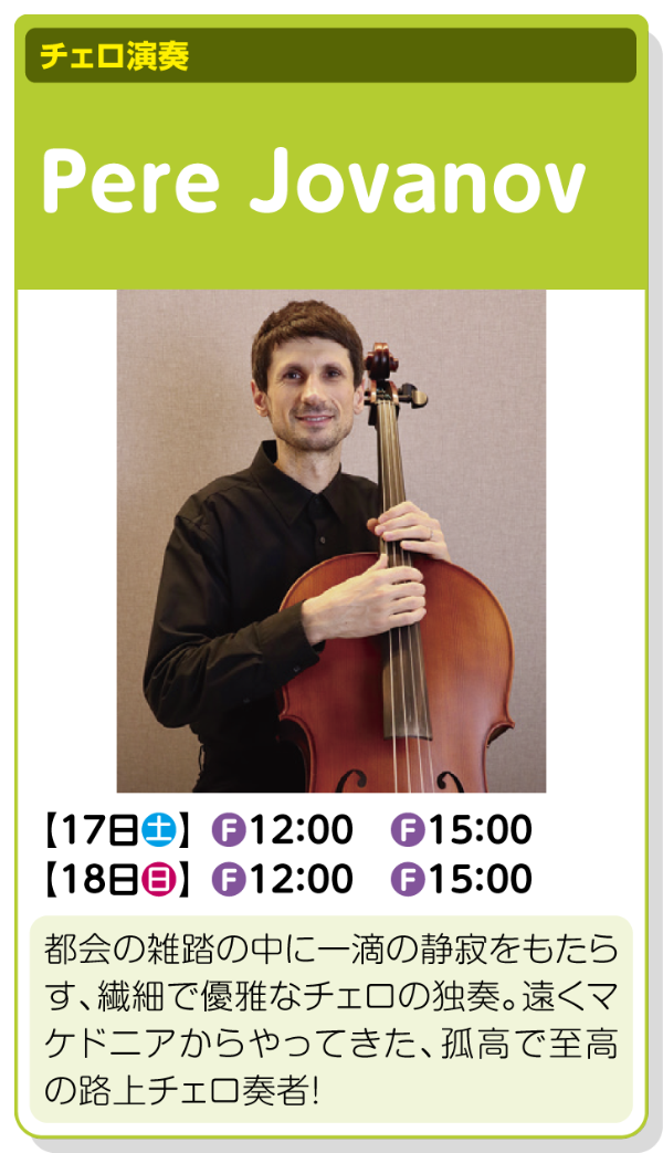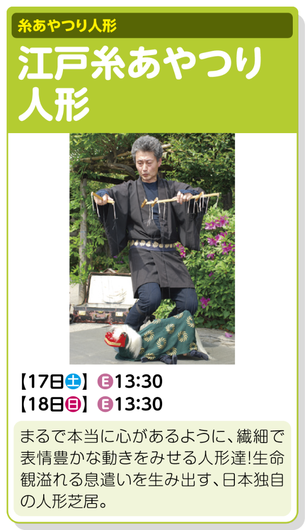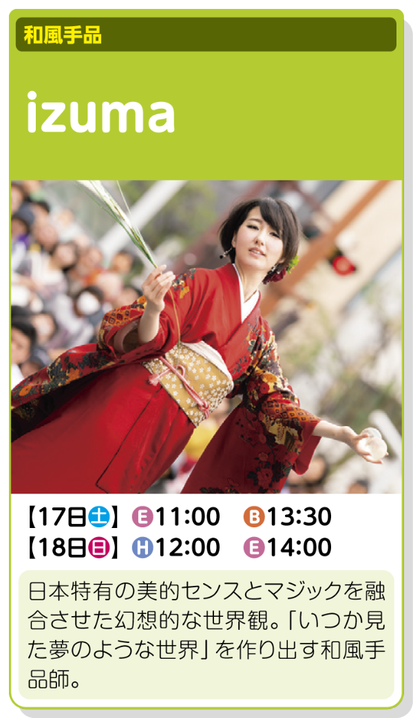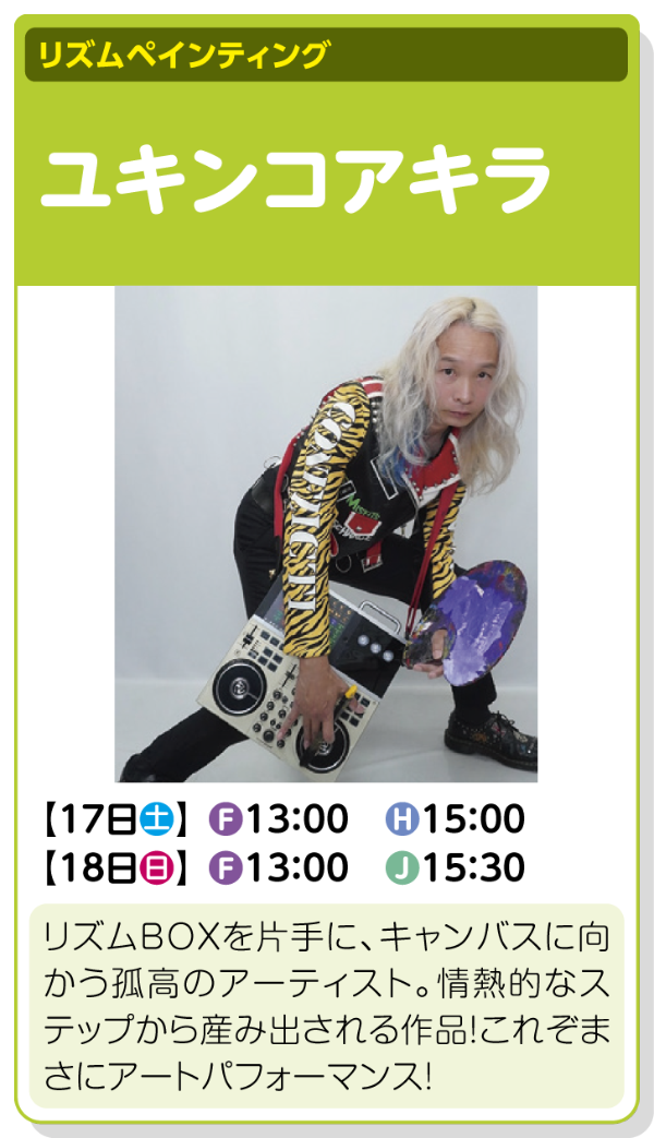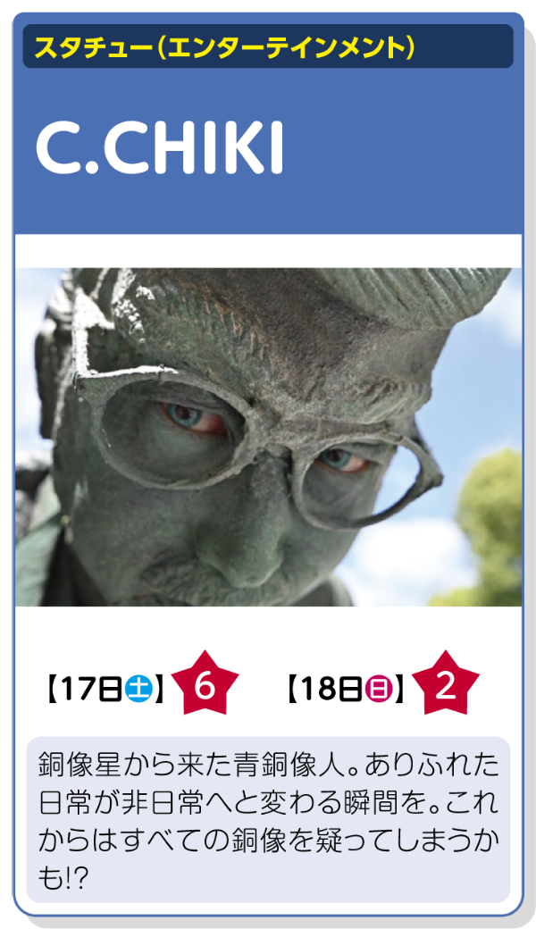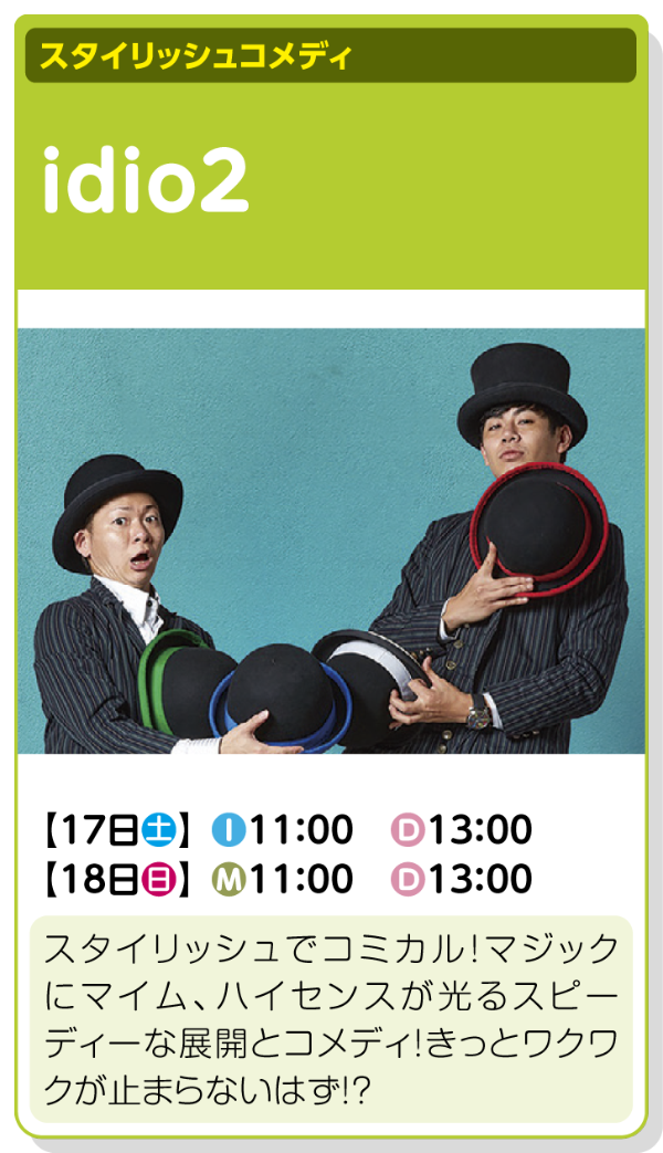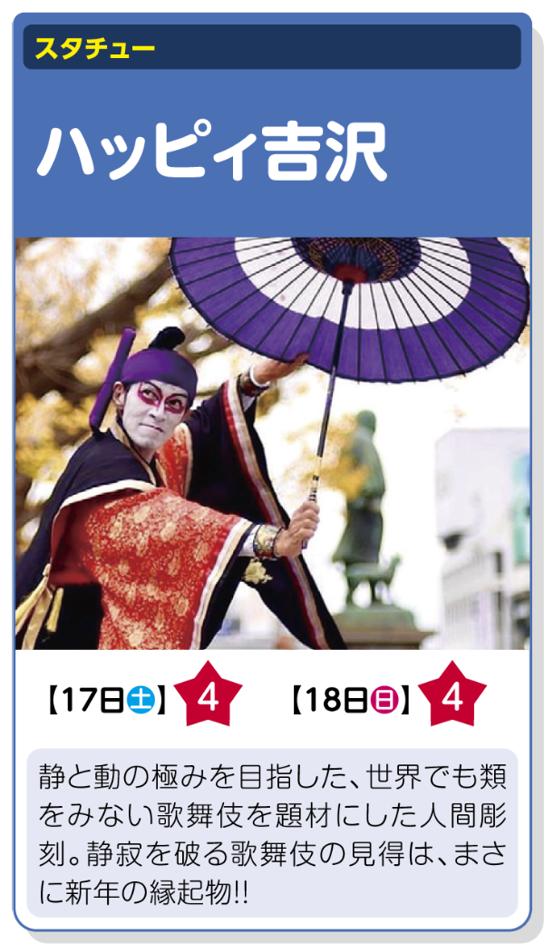 自由に動き回る大道芸人が会場のあちらこちらに出没!全員に出会うことができるかな??